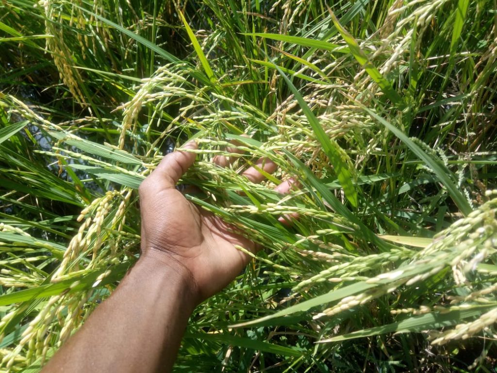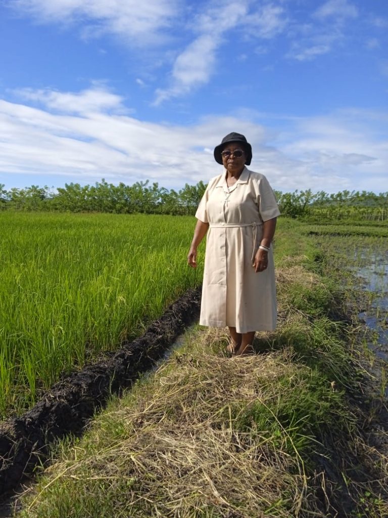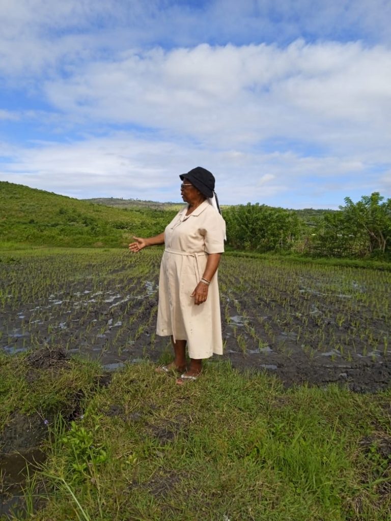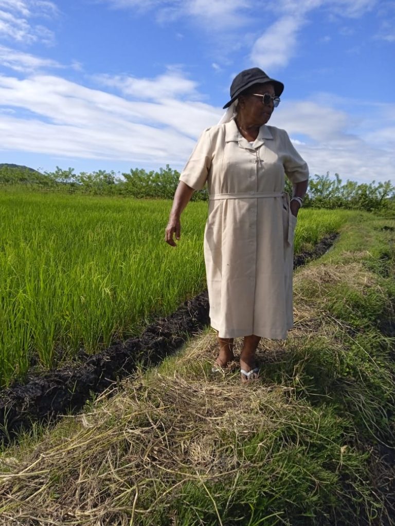 Voilà des photos de notre rizière (2 stades différents du fait du décalage de plantation) avec sœur Rosalie. Cette rizière permet d’avoir du riz pour le repas de midi des enfants plus défavorisés de notre école.